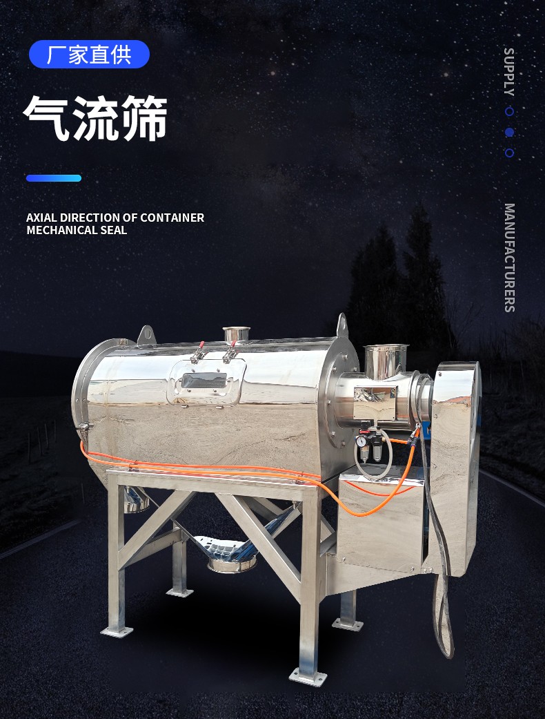 氣流篩網(wǎng)為圓筒狀,置于機體內(nèi),物料通過螺旋輸送系統(tǒng)后,和氣流混合,霧化進入網(wǎng)通內(nèi);通過網(wǎng)筒內(nèi)風輪葉片使物料同時受離心力和旋風推進力,從而迫使物料噴射過網(wǎng),由細料排出口排出,不能過網(wǎng)的物料沿筒壁從粗料排出口排出。