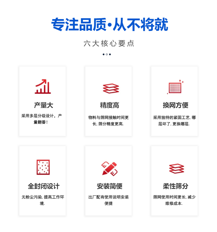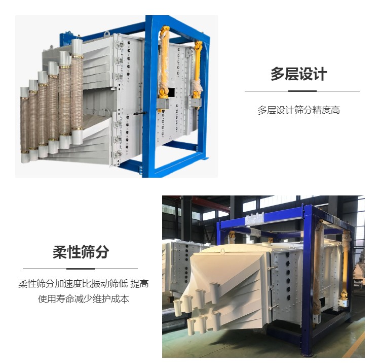 平面回轉(zhuǎn)篩是一種高標準的精細篩分機,它主要是由篩箱、驅(qū)動裝置、篩架、支撐架和減振裝置等組件構成,該產(chǎn)品結構設計緊湊,主要有以下特征。