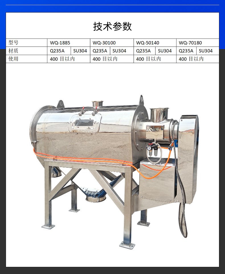 廣泛應用于各種難篩微細粉,50目-400目范圍內(nèi)的細粉都能很好的篩分。如:輕鈣粉、活性淀粉、淀粉、中藥粉、粉煤灰、鋅粉、石墨粉、陶土粉、、果蔬粉、氫氧化鈣粉、魔芋粉、熒光粉、木粉、環(huán)氧樹脂粉、硫磺粉、氧化鋁、膠木粉、氧化鎂、珍珠巖粉、鐵粉、棉斗絨等。